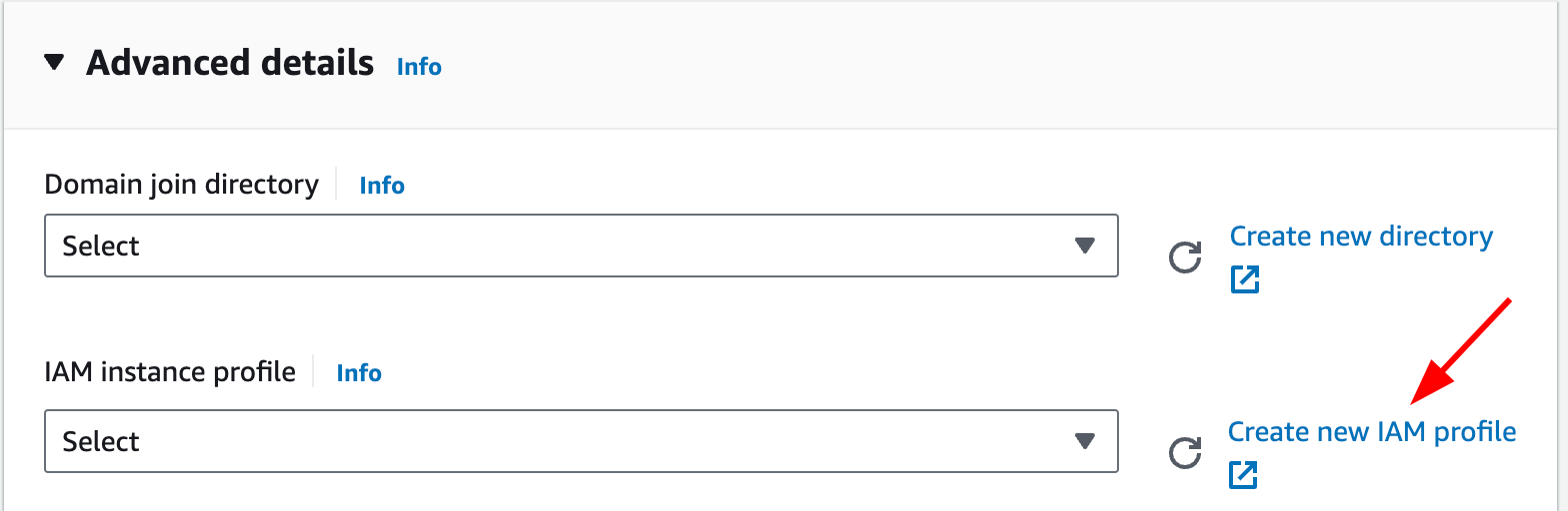 t4g.mediumas a larger instance type will increase costs.Expand the “Advanced Details” dropdown and click “Create new IAM profile”. This should open a new tab displaying the Identity and Access Management (IAM) console.